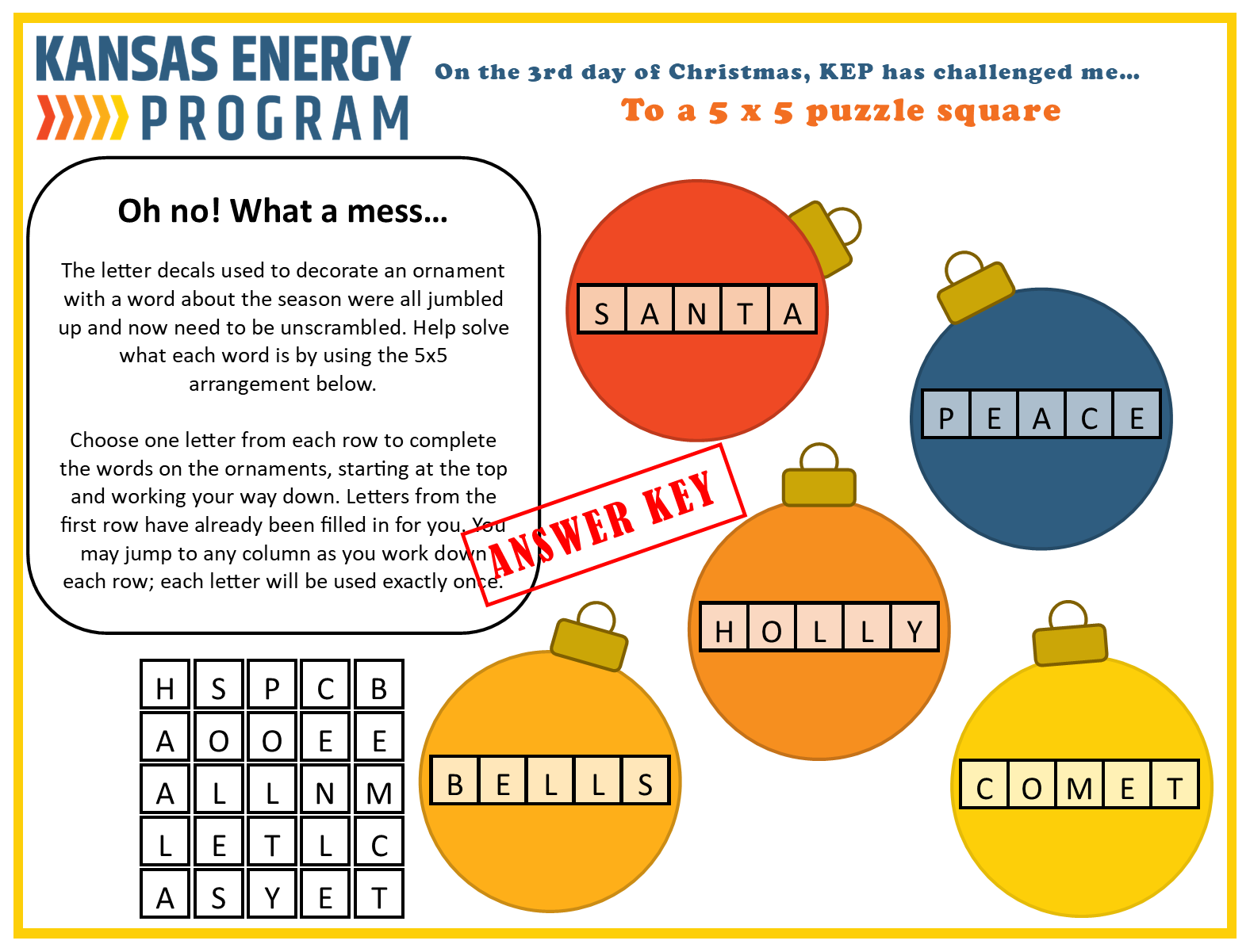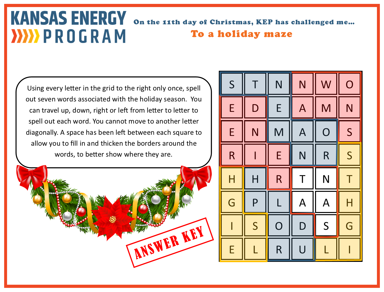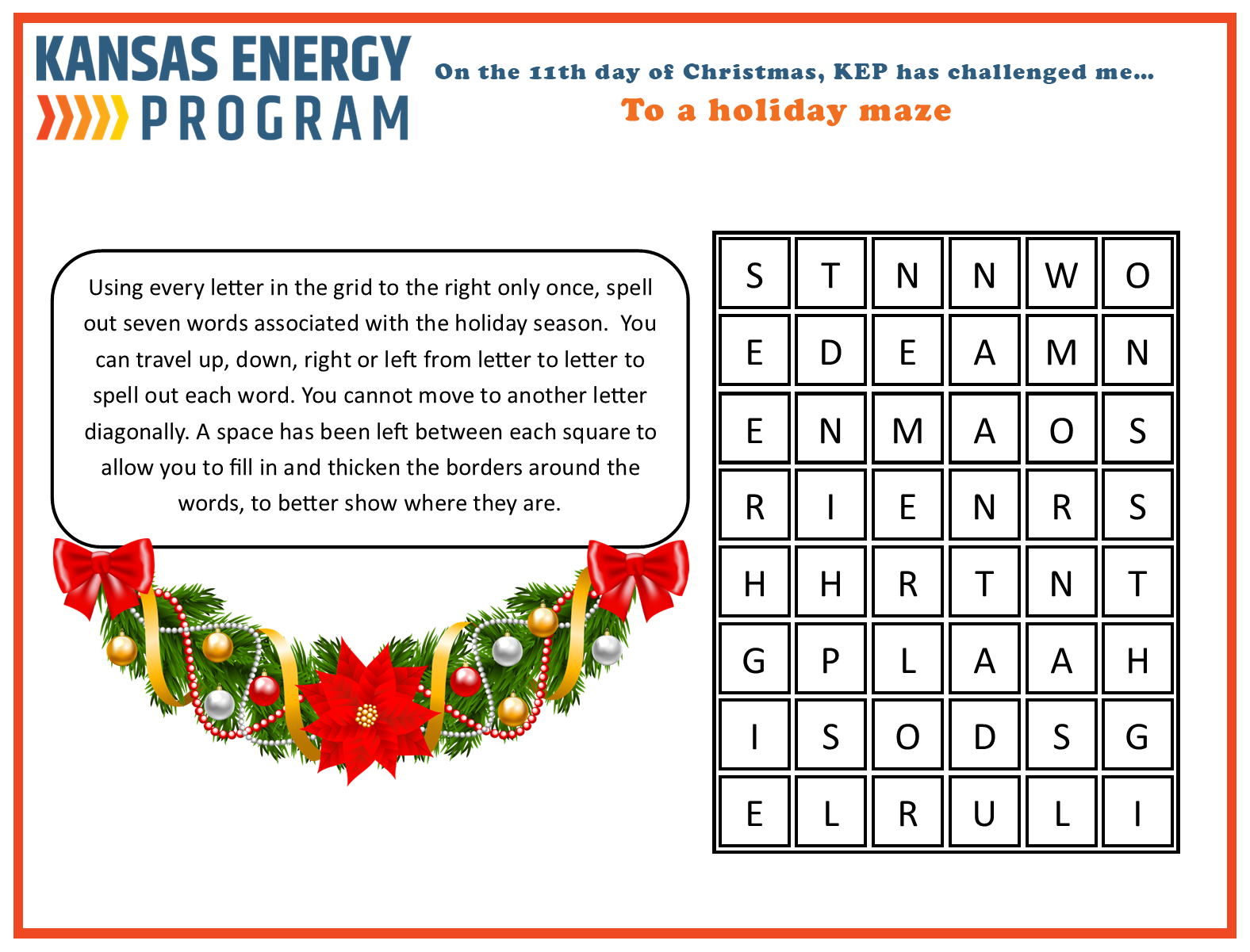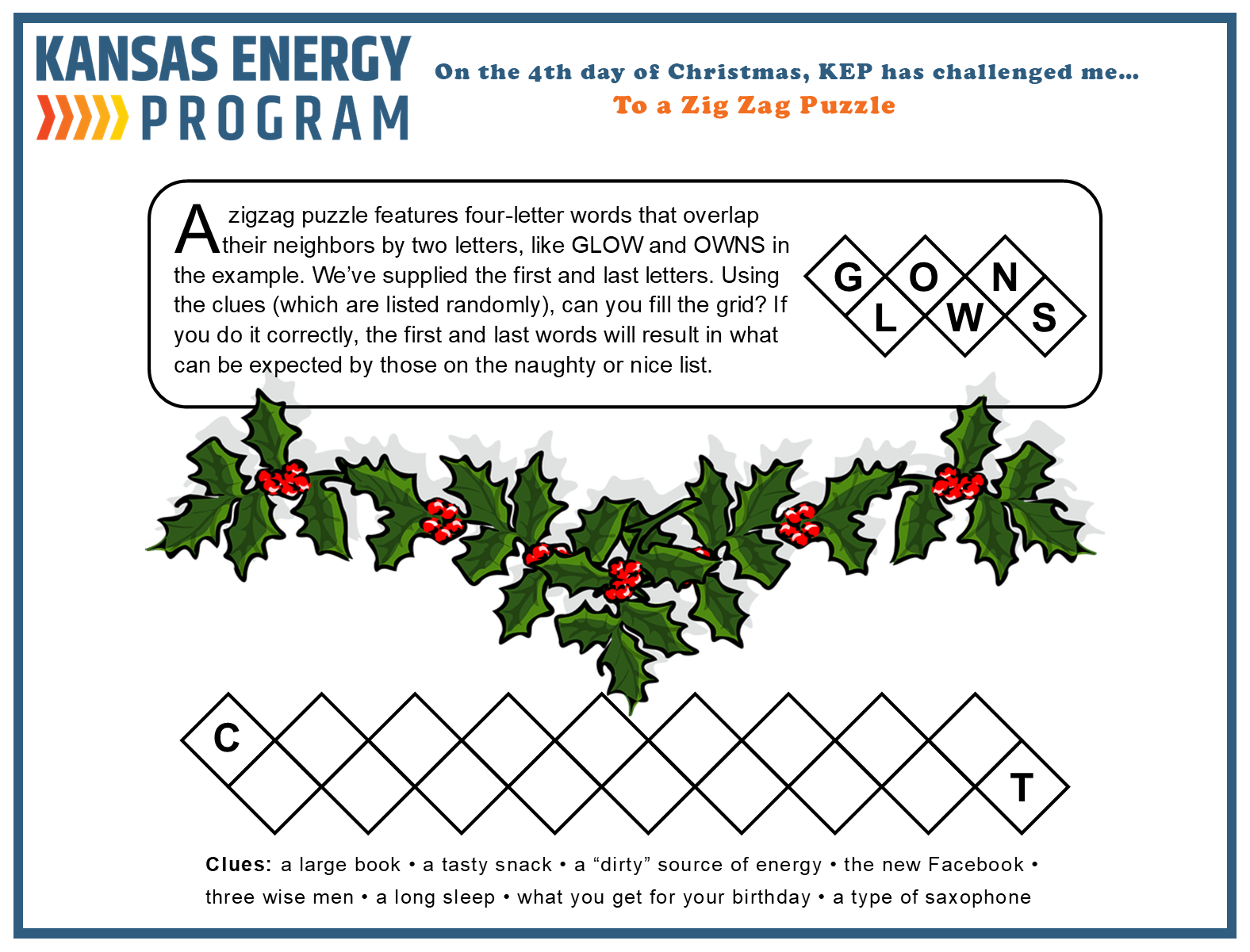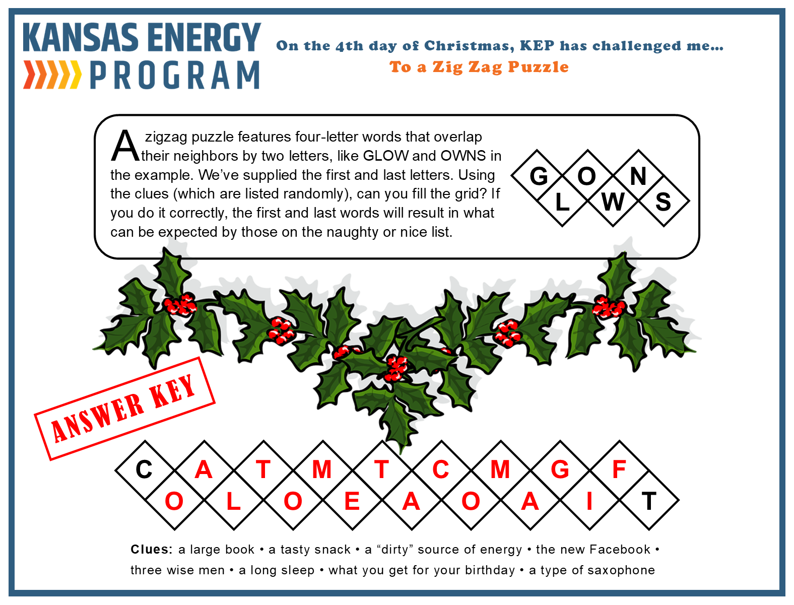 The Kansas Energy Program has put together several riddles, games, and brain teasers all focused on energy. Take a look below. Give us a shout to let us know what you think or if you have ideas for new ones.